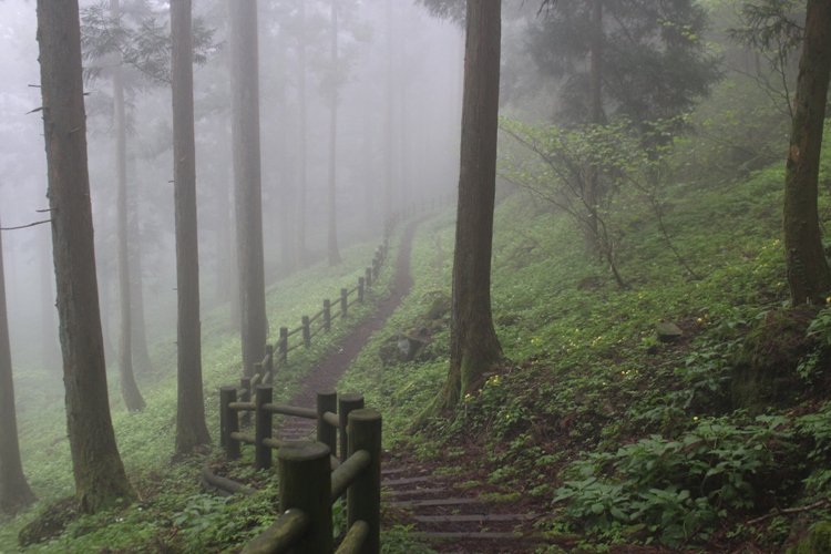 〈霧に巻かれた杉林を抜けて行く〉 |