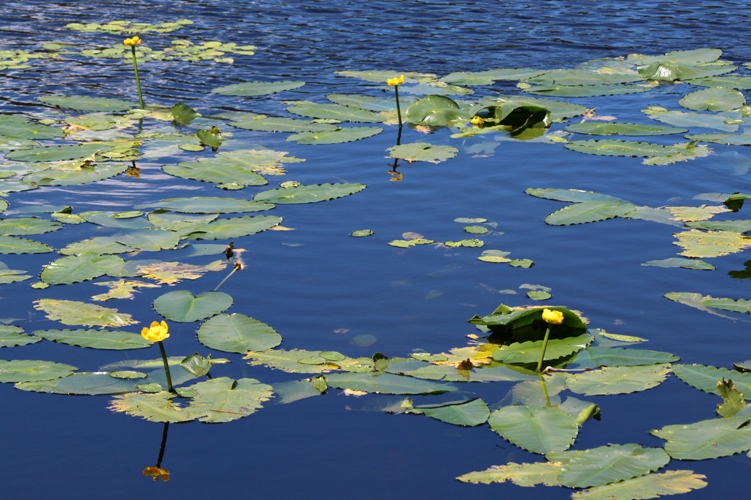 〈池のあちこちのコウホネ(スイレン科)が浮かぶ〉 |