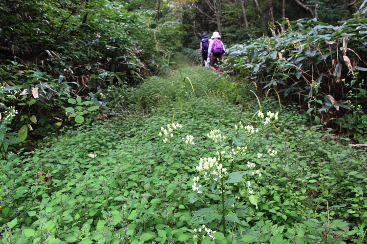 下山林道起点の柵を越えると、草に埋もれた道が山中へと入っていた。心配していた露は付いておらず、茫々と繁った草を掻き分けて何とか登り行けそうであった。その先はずっと草との格闘場であったが、シラヤマギク(キク科)やアケボノソウ(リンドウ科)の花に加えてヤマハッカ(シソ科)の花が多く、花と芳香にも満ちた野趣豊かな境地を味わせてくれる道が続いた。下山林道の最高点の峠を越えると林道は東へと進行方向を変えた。日当たりの良い南面で草の丈も余計に高くなったが、この沿道には十方山雨量観測局、残されたカーブミラーや廃車などもあって、それらを追って行くと鬱気も飛んで晴れやかに歩けたようであった。下山林道を辿ること2時間半ほどで、その林道終点に辿り着いた。