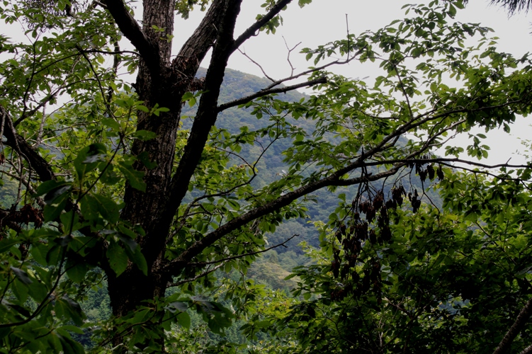 下山林道の終点部は切り拓かれた広場状になっていたが、そこも茫々の草に覆われていた。その一角で遅いランチタイムを取ったが、その直ぐ側のナラの樹にまだ新鮮な熊の食痕を見付けて驚いた。一本のナラの枝がバリバリに折られて、空疎な樹形になっており、折られた枝が樹に掛り枯れていた。ツキノワグマ達もここでブランチやディナーを摂ったようであった。30分程のランチタイムの後で、瀬戸の滝から十方山への登山道に出るためにウシロヤマ谷に一旦下った。ほんの数分で渓流に出合って、小滝を巻きながら30分程そのウシロヤマ谷を下ってから、左手から下ってきている2つ目の枝沢に入った。入口の灌木にテープが幾重にも巻かれていたのが目印になった。歩き易い沢を40分程で登り切るとお目当ての登山道に飛び出た。それまでの野趣豊かな道に比べれば高速道路のように整備された道であった。周りの樹林も美しく感じられた。足腰はそれまでの長いウォークに疲れてはいたが、これらの好条件に押されるように、まだ暫く急傾斜の道が続いたが難なくそれを登り切って十方山々頂へと辿り着いた。