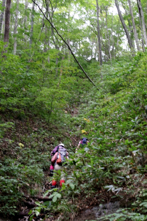 二軒小屋駐車場に車を停めて、十方山林道で水越峠を越えて細見谷を目指した。今回も仁王さん夫妻が同伴してくれた。これからの長丁場に幾ばくかの不安を口にされたものの、健気に進んで行った。旧盆を過ぎてからの多雨で十方山林道は水越峠の両側ともに荒れ果てており、ガレ場を歩くのは時間もかかり辛いものがあった。1時間半余の時間を要して下山林道の起点に到達した。