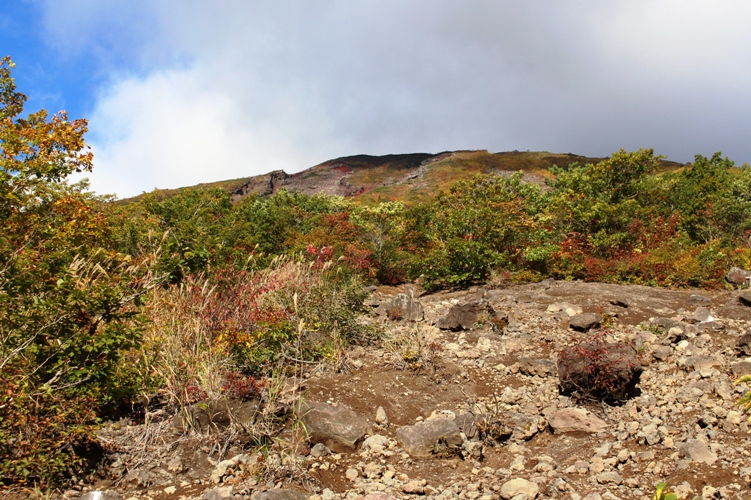 2.5合目辺りまで上ってくると紅葉が一際鮮やかになってきて、いよいよ秋景色の中を行く山行という趣きとなった。2・5合目で分岐する旧道は足場が悪い砂礫の急坂というので我々は足場の良い新道を採った。登る程に紅葉は彩りと鮮やかさを増して行った。登山道は徐々に斜度を上げて行き、4合目辺りから上は溶岩流が固まった黒々とした火成岩の道で険しさも一際厳しくなった感じであった。それでも、紅葉の美しさに厳しさを感じることはさほどはなかったが、6合目を過ぎてハイマツが現れ、そろそろ森林限界を越えるかという所まで来て、下山して来る登山者が雨具を着込んでいることに気付くようになった。皆さん異口同音に「山上は風が強いよ」と教えてくれた。7合目に出る直前になって、それまでは青空であったのだが、急に樹々の葉を打つ雨音が聞こえるようになった。直ぐに止むかと期待をしていたが、ハイマツ帯に出ようかという所で、みぞれ混じりの雨となって、瞬く間に周囲をガスに巻かれてしまった。急遽、樹林の中に戻って雨具を着た。
