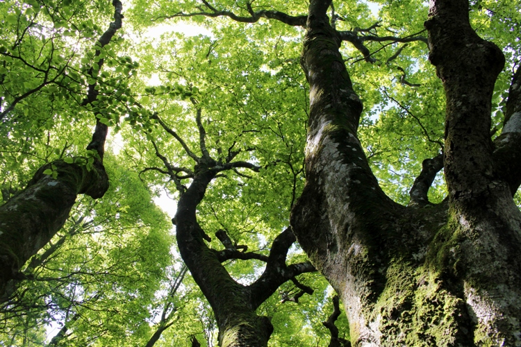 〈稜線部のブナの古木の緑も濃くなってきた〉 |