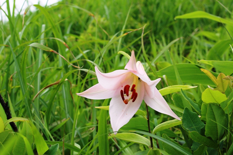 〈笹が繁る登山道脇にササユリ一輪〉 |