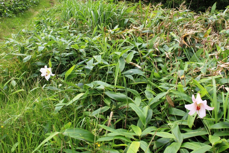 ここ数年雲月山には牛が放牧されていないことから、仲の谷にある放牧地への入口周辺は草に中に埋もれようとしていた。またその仲の谷から東屋下駐車場へと上る急斜面も笹や草刈りがなされておらず半ヤブ化していた。ヤブ化しても、この急坂に数輪のササユリが咲いていてくれたのは嬉しい限りであった。3時間足らずの山行を終えて無事に駐車場に戻った。山の空気を吸いに来られたご夫妻の姿が駐車場にあった。