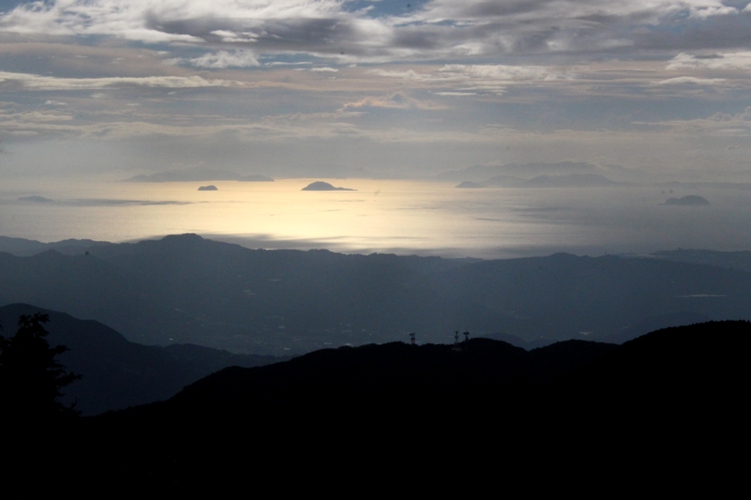 〈西に傾いた陽を映して輝く瀬戸内海を遠望する〉 |