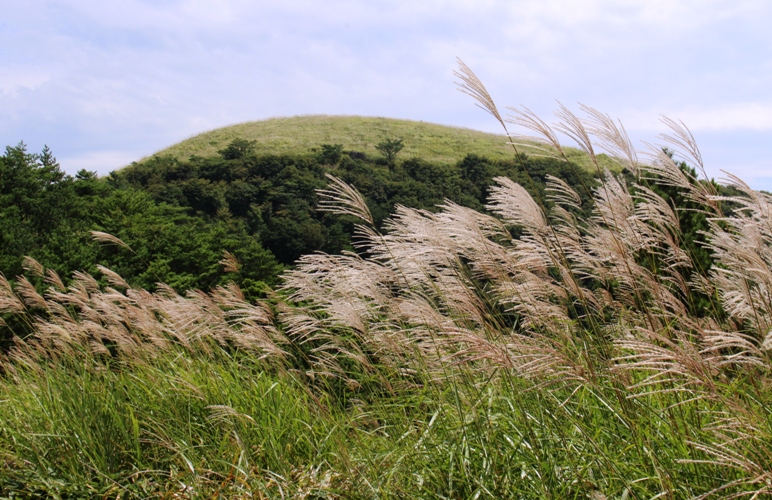 〈秋風がススキを揺らす登山道から深入山々頂を仰ぎ見る〉 |