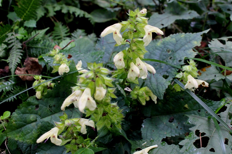 笹と芝で覆われた道後山頂々頂には沢山の登山者の姿があった。比較的広い山頂で、そこかしこの広場に散らばって皆さんランチタイムを取っていた。我々もその中の一組となった。40分程の休憩の後は、月見が丘へ戻るだけであった。岩樋山、大池を周回して来たので、下山路は両国牧場に下ってからは岩樋山南面の巻き道を採って下って行くだけの楽勝ルートであった。登りルートで出会った花々の名前の復習などをしながら下って行った。