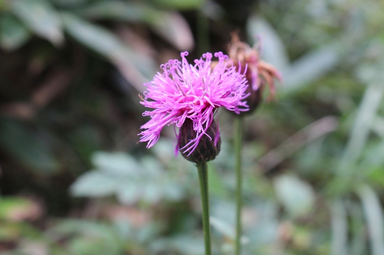 岩樋山の山頂にはかつてはなかった山頂標識が立っていた。一組の夫婦連れの姿があったが、直ぐに道後山に向かって下って行かれた。静かな山頂周辺を見渡すと、周囲の叢にはマツムシソウ、ツリガネニンジン、イヨフウロ、アキノキリンソウ、ホソバヤマハハコ、サラシナショウマなど沢山の花々が見られた。実に見応えのあるお花畑であった。かつて鳥取、広島両県の麓の農家が牛を放牧していたところから両国牧場と呼ばれている道後山との鞍部に下る道にもホソバヤマハハコの群落を始めてとして花々が多かった。両国牧場からは道後山の南側を巻いて大池を経由する登山道を採った。このルート沿いも花々の多い所であった。タムラソウ、サラシナショウマ、アケボノソウ、ツルニンジンなどの花々が見られた。巻き道が大きく左に曲がり高度を上げて行くと持丸方面から登って来る道に合わさった。そこまで登ると道後山山頂まではもう直ぐであった。