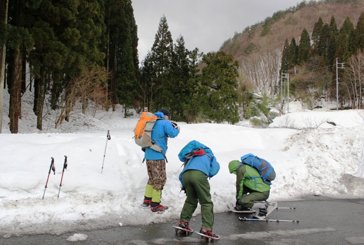 河岸を歩くこと10分程で朝方入山した二軒小屋の橋詰に無事出ることが出来た。ワカンやスノーシューを外していると、直ぐ先にある道路管理事務所から人がやって来られて、我々が出て来た方に登山道があるのかと聞かれた。きっと変なところから登山者が出てきたので不審の思われたのであろう。ともかく、小さなトピックはあったものの5時間余の山行を無事に終えて二軒小屋に帰着できた。