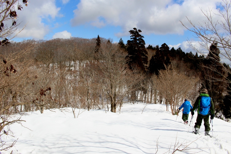 山頂部はやや冷たい風が吹いていたので先に進んでからランチタイムを取ることとなった。あるだろうと思っていた内黒峠方面への縦走路のトレースは全くなかった。天気も良くなってきていたので、縦走路の通る尾根筋を外すし心配はなく、真っ白な雪面を自由に歩いて丸子の頭から縦走路ルートを下って行った。長い下りが終わって登り返す小ピークが1152メートルピークで、ここで昼食を摂ってから、方向転換をして二軒小屋へ直接下ることとした。