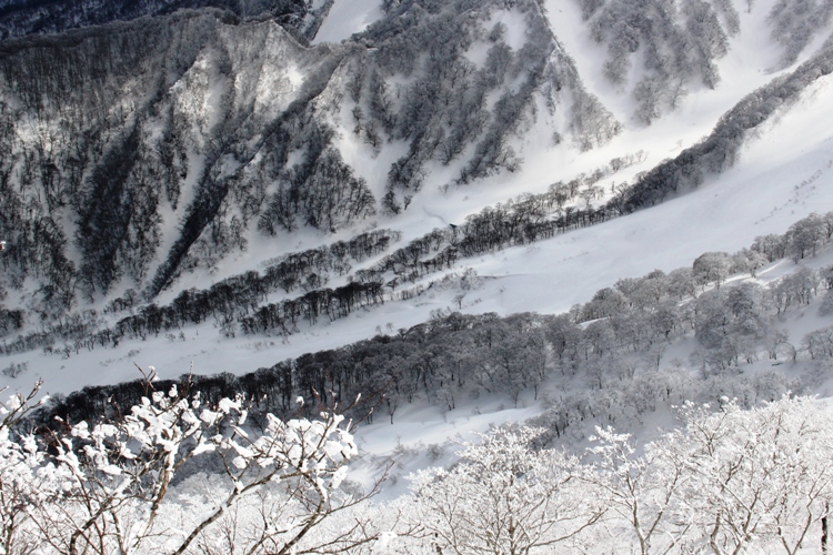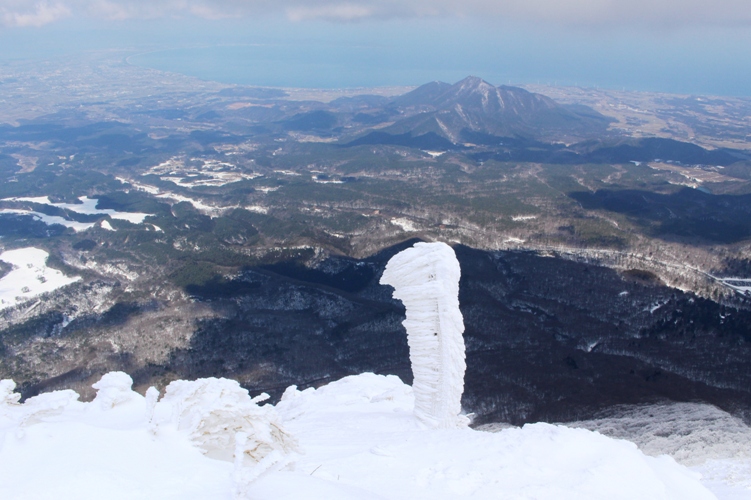 6合目避難小屋まで下って来ると、もう天気は安定してきていた。避難小屋で小休止の後は、遅れてやってきたこの好眺望と霧氷の森を楽しみながら下るだけであった。夏山登山道を下るのは久し振りで、過去の記憶はもう消えてしまっていたが、霧氷のブナ森の散策は素晴らしかった。かなり下ってから、アイゼン歩行が脚や膝に負担になって来た感じがしてきたのでアイゼンを外した。下るに従って斜度も緩くなり、潤沢な雪の道を壺足で楽に下ることが出来た。