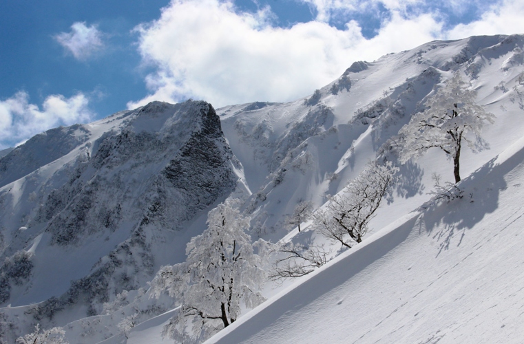 〈すっかり姿を現した南壁と鑓尾根が美しい!〉 |