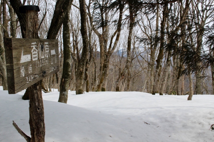 再度の香仙原の山頂で、撮り忘れていた集合写真を撮ってから、午前中に登ってきた滑峠への長い尾根筋の道を下った。この日、この山域に入ったのは我々だけのようで、山中では誰にも会うことがなかった。標高900メートルよりやや下でワカンを脱ぎ、あとは長い坂道を快調に下った。
