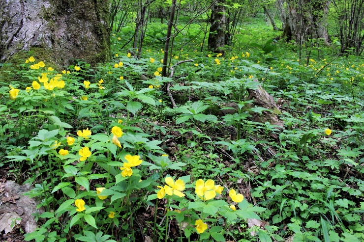 上林森林公園の駐車場にも沢山の車が停められていた。もう午後3時直前となっており、多くの登山者が続々と下山して来られていた。どこかのグループが清掃登山を行っていたようであった。下山して来る方々と行き違うように登山道を登って行った。直ぐに現れたお花畑には一面黄色のヤマブキソウが広がっており、そこに白いアクセントを付けるようにイチリンソウが小さな群れを点在させていた。水の元ではもう終わっていたヤマシャクヤクが高度の高いここではまだ花開いていた。竜神平への正面登山道の途中から直登道に入った。険阻な道の両脇の森には沢山のヤマシャクヤクの姿があり、道沿いにはヤマルリソウ、イチリンソウ、ウワバミソウなどの小さな花々が多く、シコクカッコソウの群生地では満開の花が待っていてくれた。