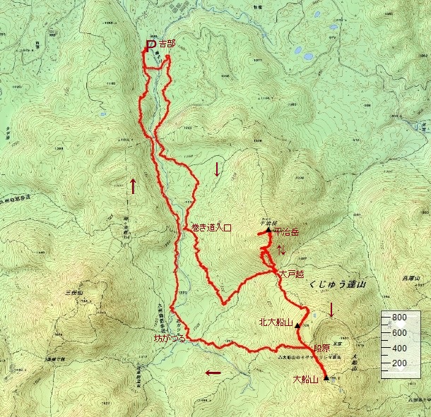 吉部駐車場3:27・・・・3:38林道分岐・・・・4:24大船林道出合・・・・4:30大船山4号集材路入口・・・・4:48大戸越方面巻き道入口・・・・5:37坊がつる道出合・・・・6:08大戸越6:23・・・・7:18南峰7:36・・・・7:51平治岳(1,642.8m)7:56・・・・8:12尾根先端部8:17・・・・8:29平治岳(1,642.8m)8:30・・・・8:40(休憩)8:47・・・・8:55南峰9:03・・・・9:24大戸越9:26・・・・10:14尾根上・・・・10:50北大船山(1,706m)10:59・・・・11:08段原11:13・・・・11:37大船山(1,786.2m)11:45・・・・12:08段原12:17・・・・13:26坊がつる13:39・・・・13:52大船林道出合・・・・14:05左岸登山道分岐・・・・15:14坊がつる方面登山口・・・・15:19吉部駐車場 〔総所要時間:11時間52分、昼食・休憩等:1時間45分、正味所要時間:10時間07分、歩行距離:19.1q、累積標高差:±1,476m〕 |