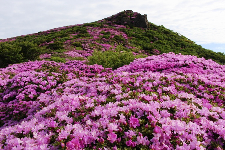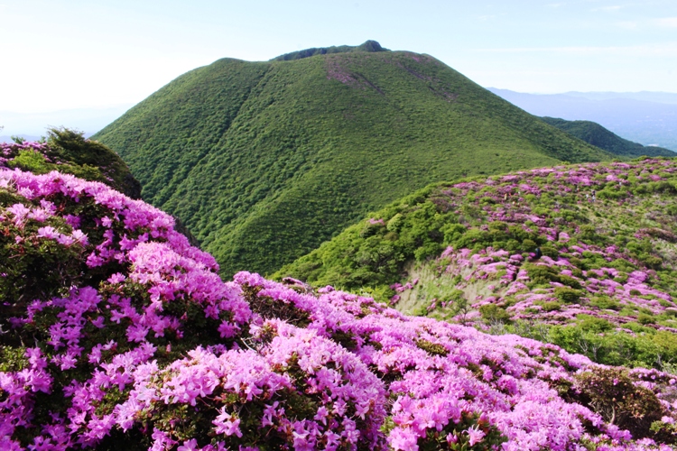 〈満開のミヤマキリシマ越しに九重連山を一望する〉 |