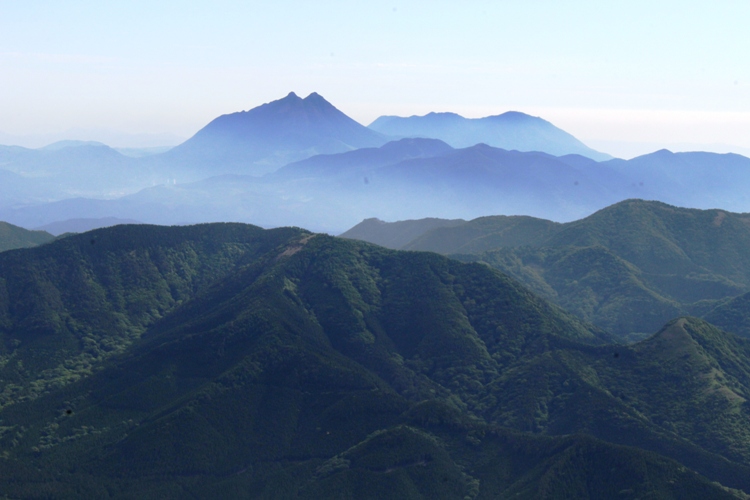 〈紫煙に霞む由布岳、鶴見岳を遠望する〉 |