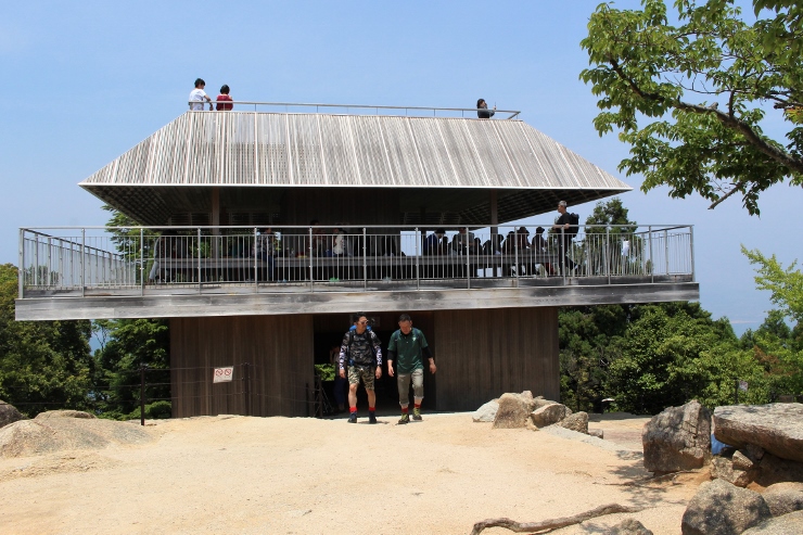 弥山の山頂に建つ展望台の上は外国人旅行者と修学旅行生で満杯といった状態であった。よく晴れた日ではあったが、山頂からの眺望もまた残念ながら霞んでいた。その展望台近くの木陰でランチタイムを取ってから、大日堂を経由して再度弥山本堂へと下った。