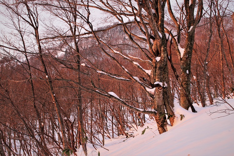 まだ暗い牛小屋高原の駐車場には1台の車もなかった。間もなくスキー客の車で埋まる駐車場の一画に車を停めて登山を開始した。登山口からカヤバタゲレンデまでは立派なトレースがあった。ゲレンデを過ぎてもやや薄いながらもトレースがあった。同行のN氏が一週間程前に残したもののようであった。たっぷり降った雪面に反射するヘッドランプの灯りが眩しかった。15分程で百本杉に達し、そこから尾根筋に踏み込んで行った。この百本杉の尾根にも同様のトレースがあった。尾根筋の登り始めはまだ暗かったが、登り行く程に東の内黒方面の山端がオレンジ色に染まり、少しずつ明るくなって行った。やがて東の山の端から太陽が顔を出すと、尾根筋にも紅い陽光が注ぎ始めた。 暫し尾根の中程に停滞して、ご来光に戯れるように20分余の時間を過ごした。 日の出後はすっかり明るくなった尾根筋を一気に主稜線まで登って行った。